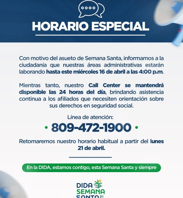 La Dirección General de Información y Defensa de los Afiliados a la Seguridad Social (DIDA), informa a la ciudadanía que su línea de asistencia telefónica 24 horas, continuará operando de manera habitual durante el asueto de Semana Santa. Con el objetivo de orientar, informar y defender los derechos de los...