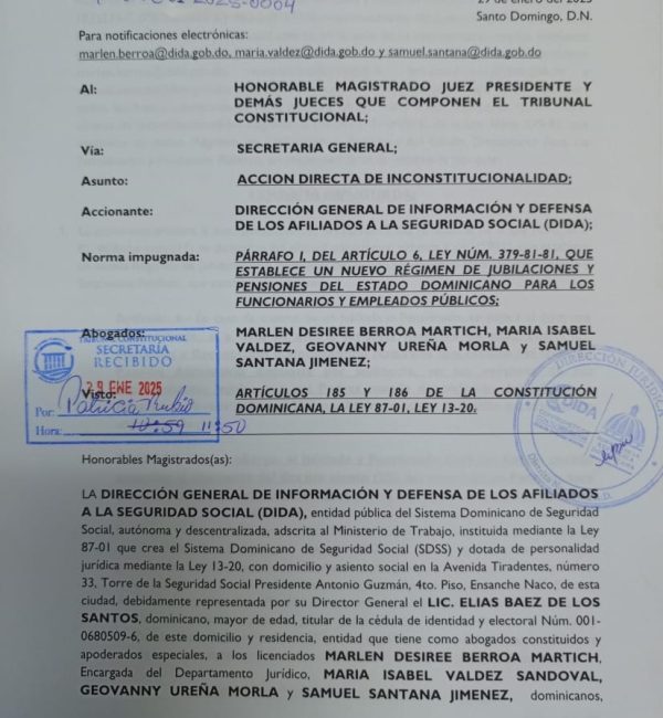 La Dirección General de Información y Defensa de los Afiliados a la Seguridad Social (DIDA) presentó una acción directa de inconstitucionalidad ante el Tribunal Constitucional contra el párrafo I del artículo 6 de la Ley núm. 379-81, que regula el régimen de pensiones del Estado dominicano. Mediante esta acción, la...