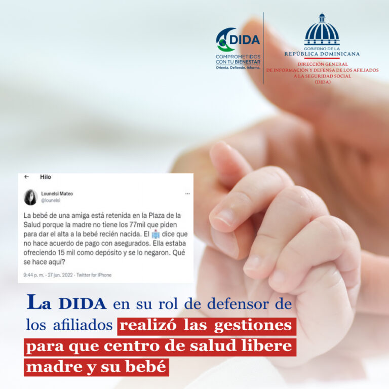 Luego de realizar las investigaciones de lugar sobre la denuncia de “Retención de madre y bebe en un centro de salud por deuda” y confirmar que se trataba de un afiliado al Sistema Dominicano de Seguridad Social (SDSS), la DIDA accionó de la siguiente manera: