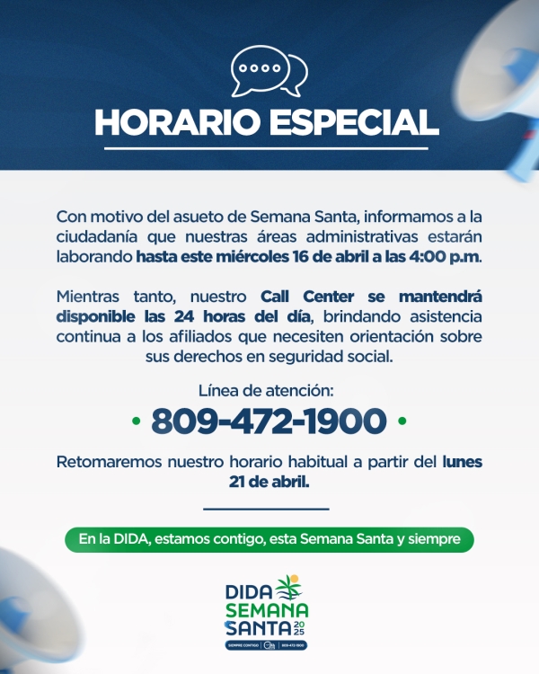 La Dirección General de Información y Defensa de los Afiliados a la Seguridad Social (DIDA), informa a la ciudadanía que su línea de asistencia telefónica 24 horas, continuará operando de manera habitual durante el asueto de Semana Santa.