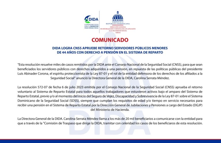 DIDA informa a la población sobre nuevos beneficios para los afiliados al Sistema de Pensiones. Resolución 572-07 de fecha 6 de julio 2023 del CNSS.