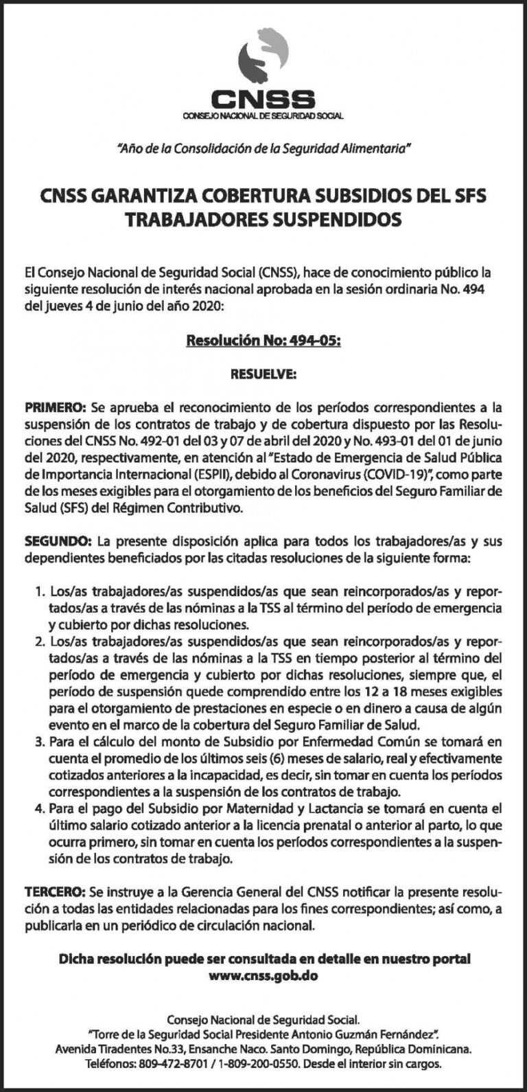 El Consejo Nacional de la Seguridad Social (CNSS) emitió la resolución No. 494-05 donde aprueba el reconocimiento de los periodos correspondientes a la suspensión de los contratos de trabajo y de cobertura dispuesto por las resoluciones del CNSS No. 492-01 y No. 493-01, en atención al "Estado de Emergencia de Salud Publica de Importancia Internacional", debido al Coronavirus, como parte de los meses exigibles para el otorgamiento de los beneficios del Seguro Familiar de Salud del Régimen Contributivo.