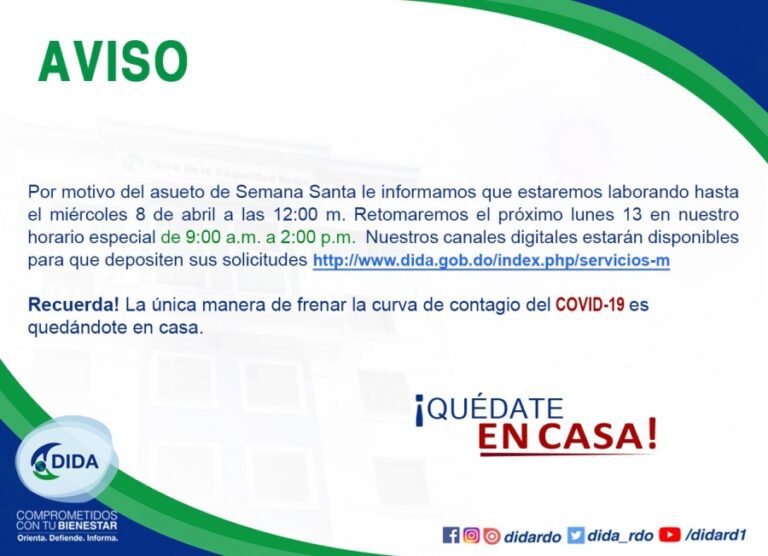 Por motivo de asueto de Semana Santa le informamos que estaremos laborando hasta el miércoles 8 de abril a las 12:00 M. Retomaremos el próximo lunes 13 en nuestro horario especial de 9:00 a.m. a 2:00 p.m. Nuestros canales digitales estarán disponibles para que depositen sus solicitudes http://dida.gob.do/index.php/servicios