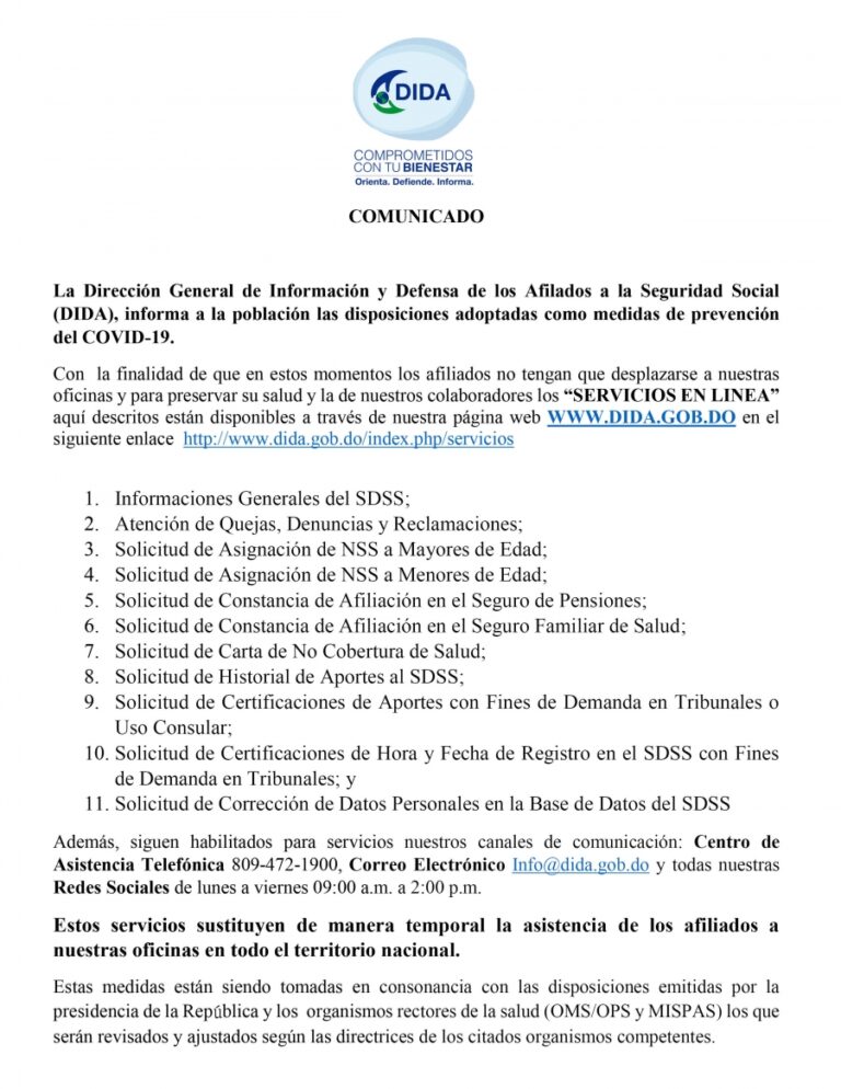 La Dirección General de Información y Defensa de los Afilados a la Seguridad Social (DIDA), informa a la población las disposiciones adoptadas como medidas de prevención del COVID-19.