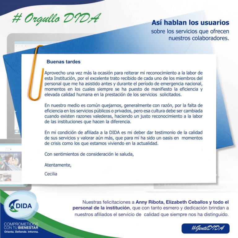 en mi condición de afiliada a la DIDA es mi deber dar testimonio de la calidad de sus servicios y valorar aún más, que para mi ha sido un oasis en momentos de crisis como los que estamos viviendo en la actualidad.