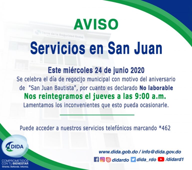 Este miercoles 24 de junio 2020 se celebra el día de regocijo municipal con motivo del aniversario de "San Juan Bautista", por cuanto es declarado No laborable. Nos reiteramos el jueves a las 9:00 a.m. Lamentamos los inconvenientes que esto pueda ocasionarle.