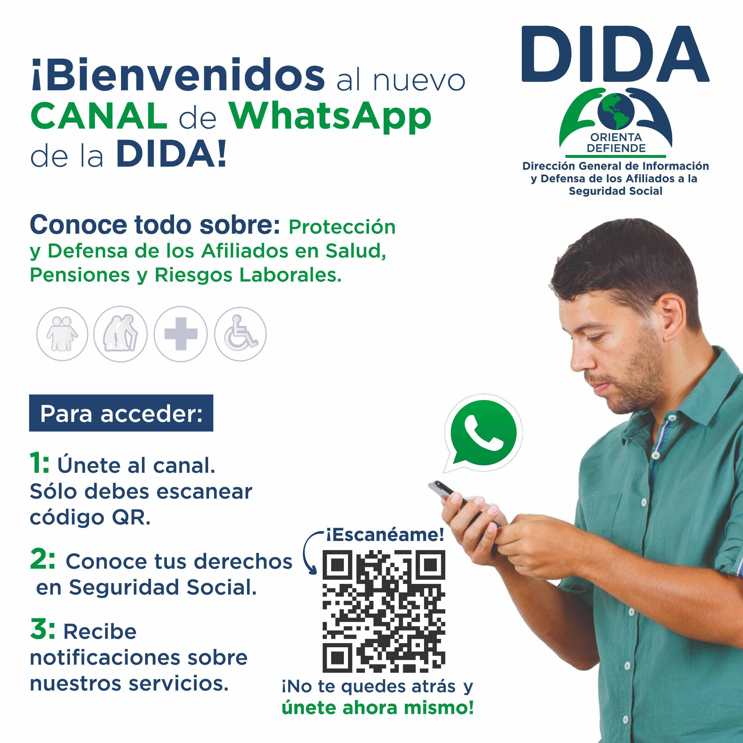 Ahora puedes acceder a toda la información que necesitas sobre seguridad social y nuestros servicios de forma rápida y sencilla. Únete al nuevo canal de WhatsApp de la DIDA y mantente informado sobre tus derechos como ciudadano. ¡Es fácil y directo!
