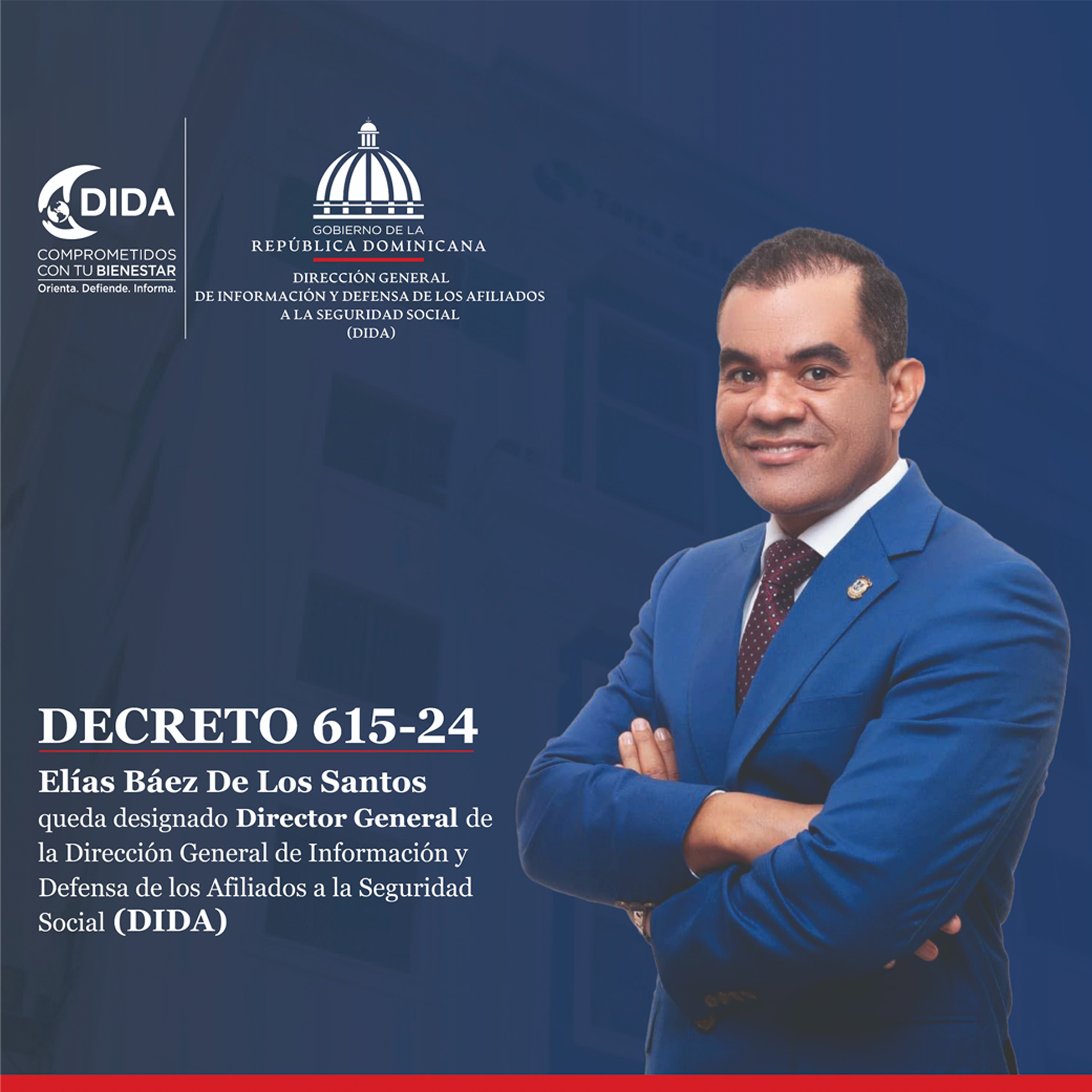 Nos complace informar a los afiliados al Sistema Dominicano de Seguridad Social (SDSS) y todos nuestros seguidores sobre la reciente designación del Lic. Elías Báez como Director General de la Dirección General de Información y Defensa de los Afiliados a la Seguridad Social (DIDA). Esta designación ha sido realizada a...